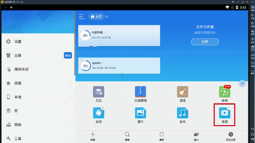 打开ES文件管理器,点击【视频】,即可看到刚刚保存的抖音视频,如果没有找到视频,建议重启安卓模拟器,等个2-5分钟,刷新软件即可。