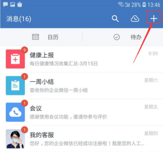 2.进入企业微信后,点击消息界面右上方的“+”按钮。