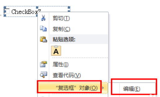 5.右击“复选框”,在打开的菜单中依次:复选框对象--编辑;这时复选框就处于编辑状态,可对复选框的文字进行修改。新建的复选框文字都是CheckBox+数字。