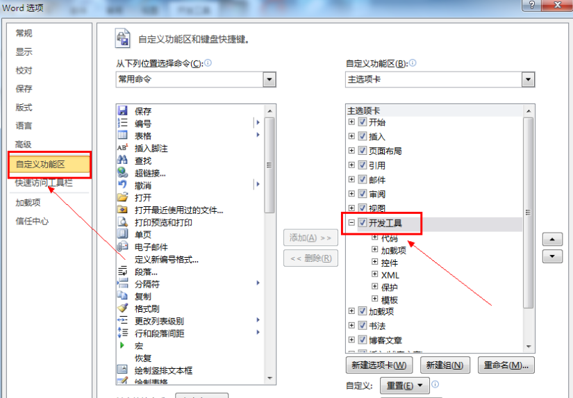 2.打开word选项界面,在自定义功能区的下方有个开发者工具,将前面的“√”勾上,这样使用起来就十分方便了