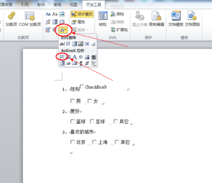 4.将光标移动到要插入复选框中的地方,然后打开控件下拉列表,选择“复选框”插入到指定位置,