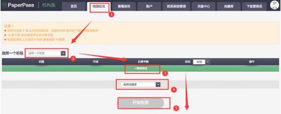 5、进入到paperpass机构版主界面,点击上方菜单中的【检测论文】,然后在下方界面中选择班级,接着点击【继续添加】,将需要进行查重的论文文档上传。
