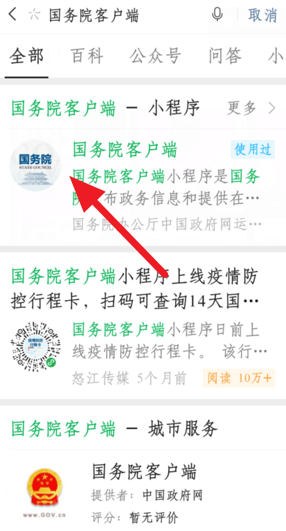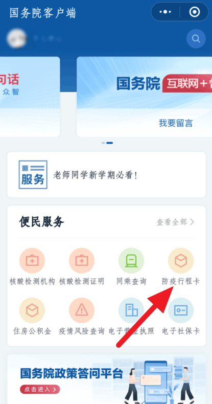 如图,点击打开国务院客户端小程序,进入小程序,点击【便民服务】——【防疫行程卡】,