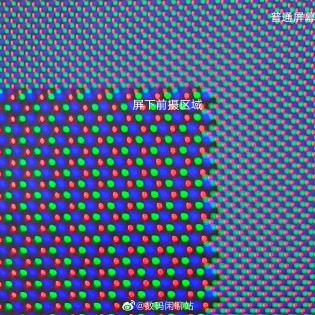 可以看到,在前置摄像头的上方有一个很小的方形区域,在其内部的像素密度只有 720p,要比屏幕其余区域的 1080p 更低。而且在像素的排列方式上,屏下摄像头区域与主屏的 Delta 排列又有一些差别。在纯色的背景下,可比较清楚看到方形区域的位置。此外,@数码闲聊站 还表示,方形区域有单独的屏幕控制驱动元件。