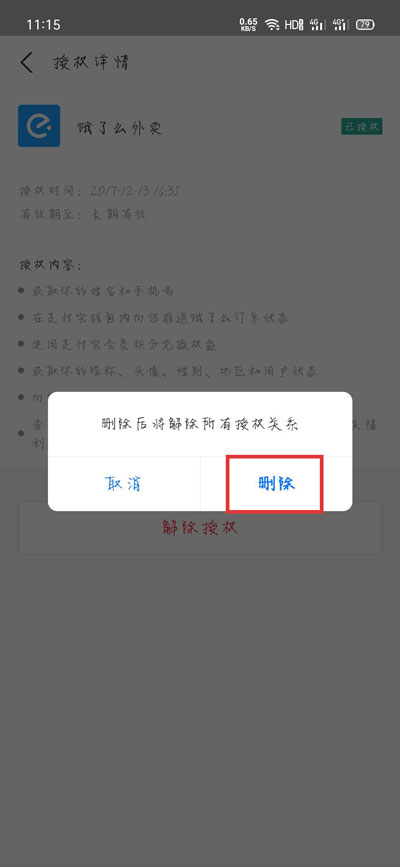 6、点击【解除授权】,在弹出的窗口中点击【删除】,即可解除饿了么账号和支付宝账号的绑定;