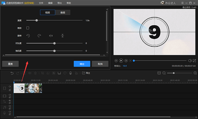 双击轨道中的片头,即可出现片头的一些基本设置,大家可以修改片头视频中的亮度、速度(即播放速度),