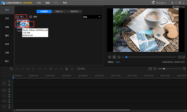 首先下载安装迅捷视频剪辑软件,打开软件,注册账号,进入界面,添加视频素材,点击【导入】,选择视频文件;如果是本地已有的素材,直接将其添加至视频轨道,