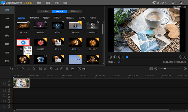 视频添加成功,在素材库点击【精美片头】,选择合适的倒计时片头并下载,然后点击【+】,或者右击片头,选择【添加到轨道】命令,将倒计时片头添加到轨道,
