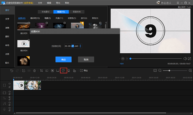 需要注意的是,不同的倒计时视频片头的播放时长并不一样,选中轨道中的视频片头,点击【时长】,可以修改持续时间,不过只能在默认给出的时长以内调整,调整之后点击确定即可。