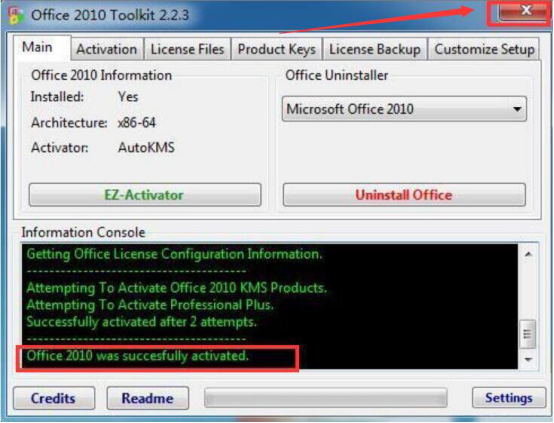 4.当激活的详情中出现“Office 2010 was succesfully activated”的字样时,说明Office 2010 toolkit 已经成功激活了Office 2010。再点击“关闭”按钮退出该激活工具。