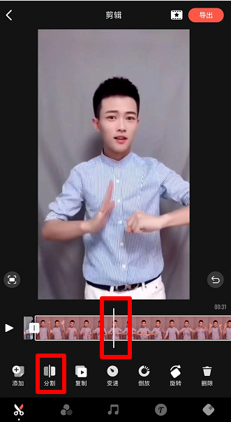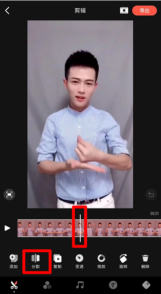 导入视频,进入视频剪辑窗口,如图,将白线拖动到想要添加放大效果的起始位置,然后点击【分割】,