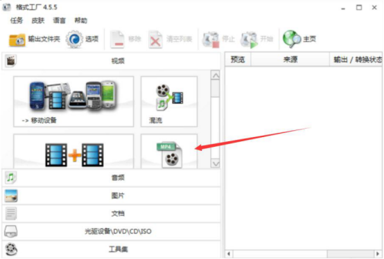 2.进入格式工厂的操作界面。在“视频”的输出格式列表中,选择自己想要的格式。例如,这里我们点击通用的MP4格式。