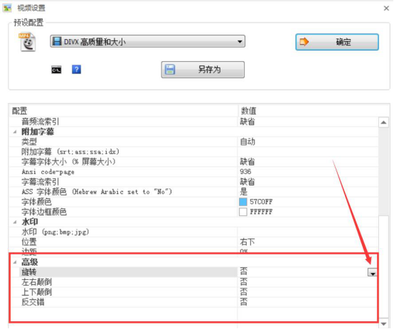 5.在格式工厂的视频设置界面,找到“高级”设置项,点击“旋转”的下拉菜单按钮,根据自己的需要设置视频翻转的角度。
