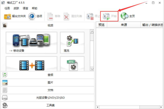 6.设置好视频翻转的角度后,我们回到格式工厂的主界面,点击“开始”按钮,格式工厂便开始执行翻转视频的指令了。