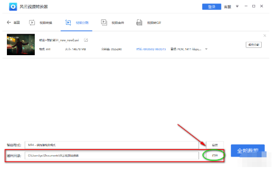 7、然后就回到原视频分割界面,点击下方“输出目录”右侧【打开】,设置一下输出分割视频的路径。