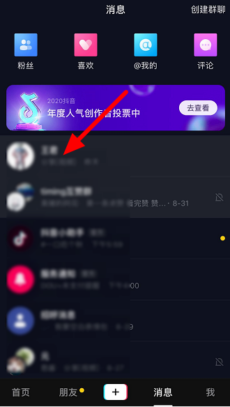 在手机中打开抖音APP,进入界面,点击下方【消息】选项,