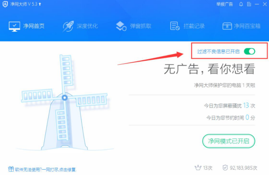 6.进入ADSafe净网大师操作界面,启用“过滤不良信息”