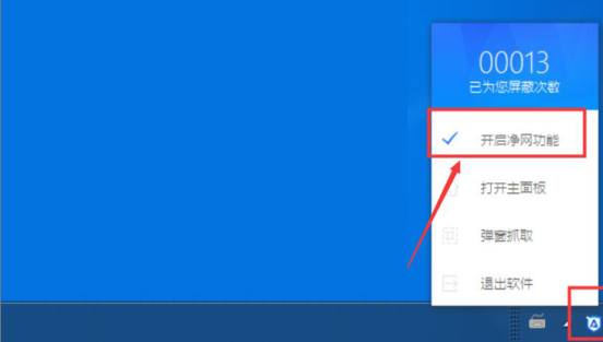 9.最后,在电脑任务栏的右边,右键单击ADSafe净网大师的图标,并在它弹出的窗口中勾选“开启净网功能”。再重启浏览器,便可以看到网站视频无广告了,说明ADSafe净网大师能继续使用了。