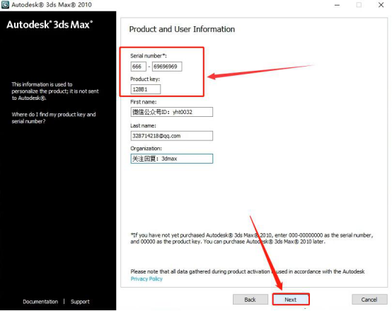 6.然后,自定义个人用户信息,并输入3dmax2010的序列号和密钥,如下图所示。