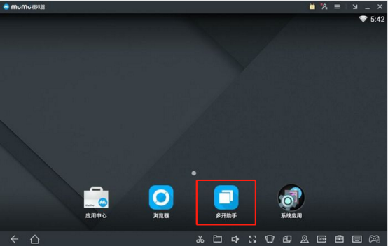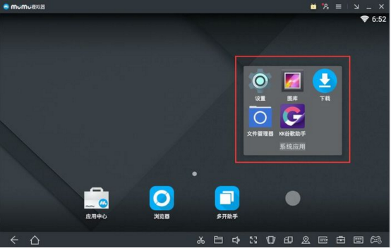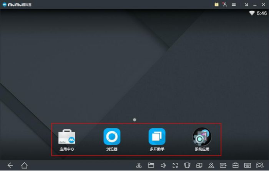 1、进入MuMu模拟器主界面,可以看到这里有【应用中心】、【浏览器】、【多开助手】、【系统应用】4个选项。