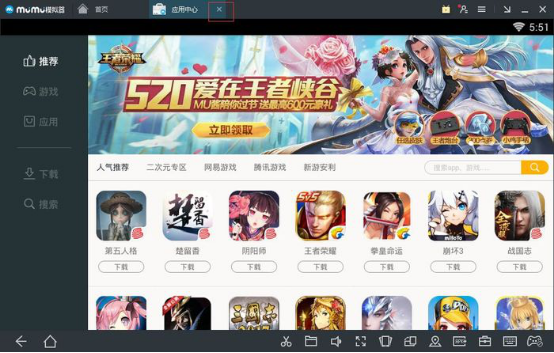 2、点击【应用中心】即可打开游戏APP选择界面,这里提供了几乎所有常见的手游APP,点击任意游戏APP下方的【下载】即可下载安装该游戏。