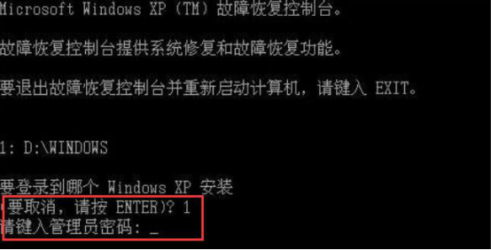 4.在故障恢复控制台的命令符中,选择安装在第一个分区,当管理员没有密码时,就直接按回车键,再输入EXIT,将电脑重启,便可以修复电脑蓝屏了。