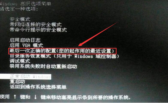 3.或者,我们也可以回到windows高级选项菜单,点击“最后一次正确的配置”后,再按回车键,重启电脑,有时候这样做,也能修复电脑蓝屏。