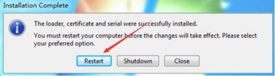 4.稍等一两分钟,windows loader激活工具会弹出安装完成的提示窗口。我们点击“Restart”按钮便会重启电脑。