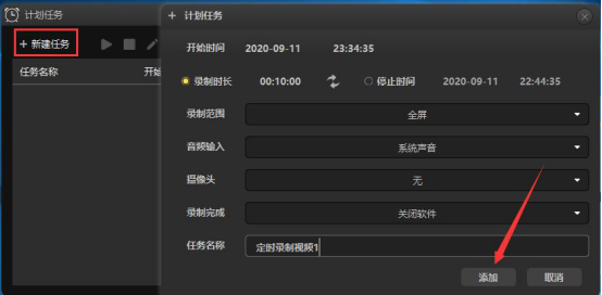 5.进入录大咖的计划任务界面后,点击“+新建任务”,弹出“+计划任务”窗口,根据自己的情况,设置定时录制视频的开始时间、录制时长、录制范围、录制完成后是否关闭软件等等,再点击“添加”按钮。
