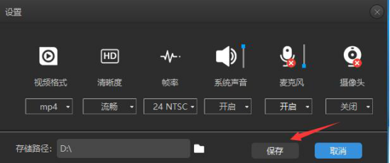 3.进入录大咖的设置页面,我们设置视频定时录制的格式、清晰度、存储路径和是否开始系统声音、麦克风、摄像头。当参数都设置完成了,就点击“保存”按钮。