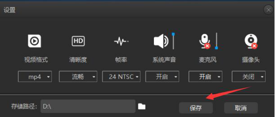 6.进入录大咖的设置页面后,要注意它的使用技巧。我们一般选择“MP4”通用格式,根据实际需要设置录制的清晰度。如果不想让别人听到录制时候的环境声音,就可以关闭系统声音和麦克风,再点击“保存”按钮。