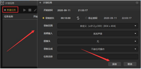 8.在录大咖的计划任务界面中,点击“+新建任务”,弹出“+计划任务”窗口,根据自己需要来设置开始时间、录制时长、录制完成后是否自动关闭录大咖或者关机等等,再点击“添加”按钮。