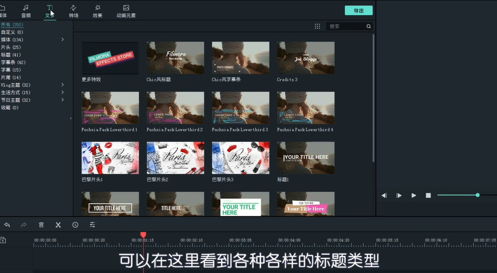 点击【文字】模块,你可以给视频添加标题,双击标题即可进行预览,然后选择自己喜欢的标题,将其拖拽到轨道,