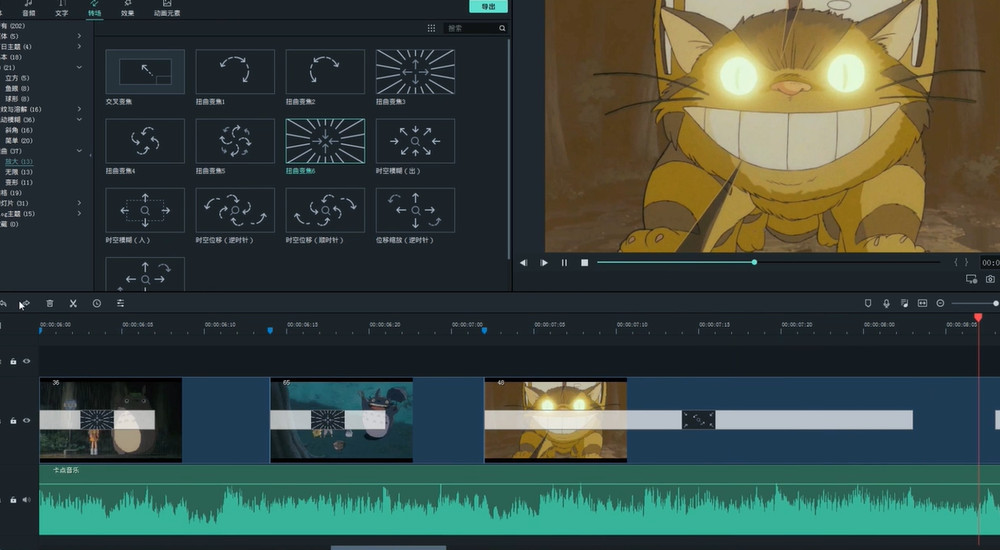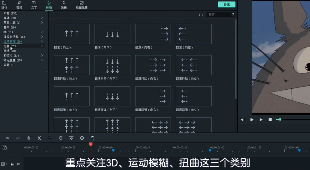 为了让卡点更加有节奏感,你可以添加一些转场效果,例如3D、运动模糊、扭曲这三个类别,