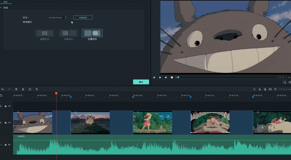 将转场效果放在两个素材之间,也可以放在素材的开始或者结尾,