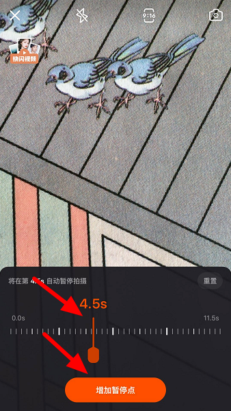 如图,拖动底部的滑块,固定暂停拍摄的时间,点击【增加暂停点】,
