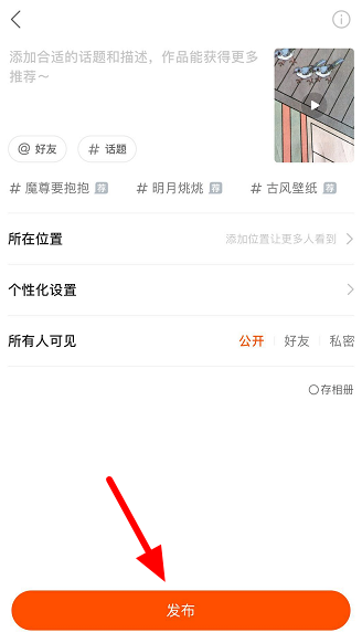 拍好之后进入下一步操作,添加合适的描述、话题,点击【发布】,即可上传短视频作品。