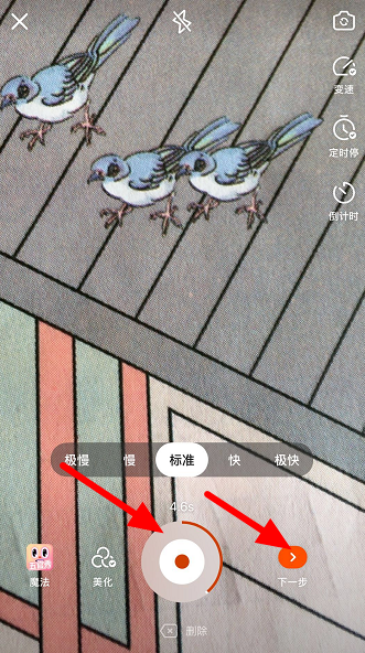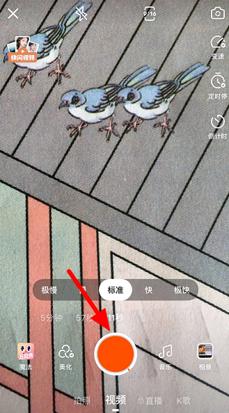 点击红色按钮,开始拍摄视频,一旦到了设定时间,快手就会暂停拍摄,你可以进行换装,然后继续点击拍摄按钮,