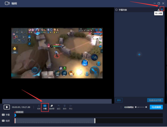 3.将视频导入后,我们点击视频预览窗口下方的“字幕”,在右侧便会展示字幕列表,我们点击“导入字幕”按钮。