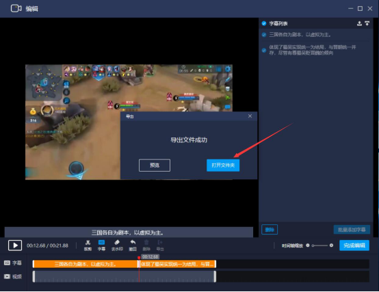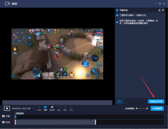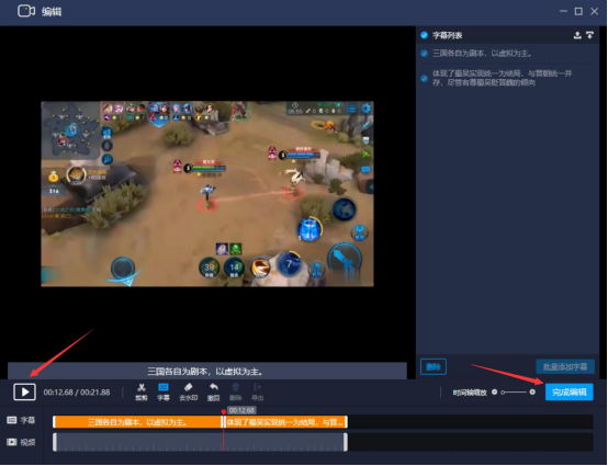 6.鼠标分别单击界面左下方的字幕轨道,字幕便会批量添加到该视频。可以自由调节字幕对应的时间段的长度,将全部的字幕铺满整个字幕轨道。点击“播放”按钮,预览批量添加了字幕后的视频播放效果。确认无误后,点击“完成编辑”按钮。