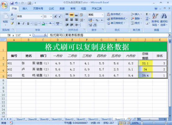 2、如果需要复制表格数据,大多数人想到的是复制粘贴,然后这样方法很多时候容易将格式漏掉。但如果使用格式刷来复制数据就不一样了。首先选中要复制的数据,接着双击格式刷,之后选择粘贴的位置,然后按下ENTER键这样格式和数据就都被完整的粘贴下来。