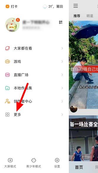 在手机中打开快手APP,进入界面,点击左上角的主菜单,弹出侧边栏,点击【更多】选项,