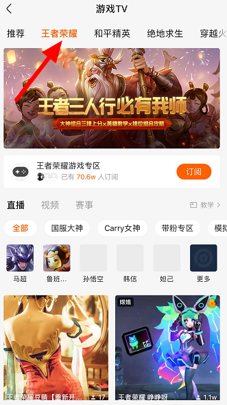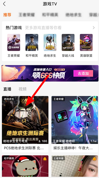 打开游戏TV功能,如图,这里汇总了各种热门的游戏直播,包括王者荣耀、绝地求生、和平精英等等,点击进入直播间即可观看,