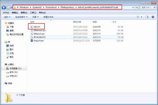 4、如果找不到bth.inf文件的话,那么就按照C:/Windows/System32/DriverStore/FileRepository/ “bth.Inf”开头的文件夹,在其中找到bth.Inf文件,将它复制粘贴到C:\\Windows\\inf目录下即可。