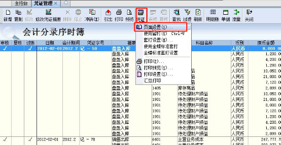 3、点击工具栏中的【凭证】,在其下拉菜单中,点击【页面设置】。