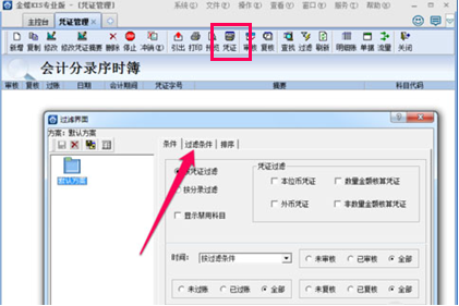 2、弹出过滤界面窗口,点击【过滤条件】,然后根据需要勾对应条件,比如审核与否、过账与否、复核与否,设置完成后,点击【确定】。