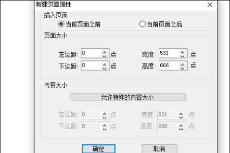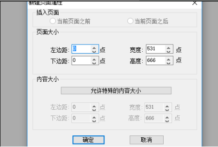 5、弹出新建页面属性窗口,在该窗口中设置插入页面、页面大小、内容大小等选项,最后点击【确定】。