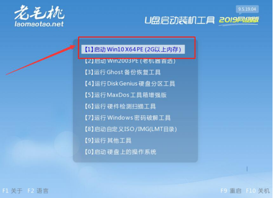 2.进入老毛桃winpe菜单向导页,点击“【1】Win10X64PE(2G以上内存)”,再按一下回车键确定该操作。