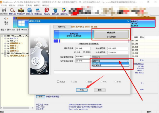 5.接下来,在老毛桃winpe的“调整分区容量”窗口中,我们设置拆分硬盘空间的大小,并选择“保持空闲”,在点击“开始”按钮。