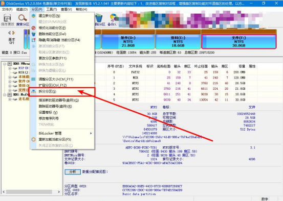 4.在老毛桃winpe的分区工具中,可以看到电脑所有磁盘的空间情况,选择想要拆分的硬盘分区,例如,这里选择的是文件F盘。再点击“分区”菜单中的“拆分分区”。